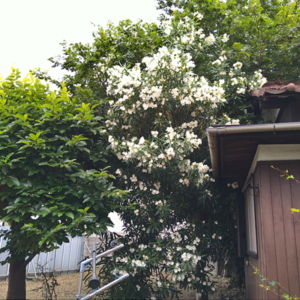 どうしたのでしょうか??? ツイート 主人が2階から降りてきて、 奥の庭に異常なほど大きな白い花の集団が・・・・ 「あんな白い花あったかなぁ~???」 以前から奥には余り足を踏み入れないので そういえば、あったような気がしますが・・・ いつの間にか大きくなった木に 本当に驚くほど沢山の花が付いていました。 雑草などを伐採してスッキリしたので、 余計目立ったのでしょう( ^)o(^ )