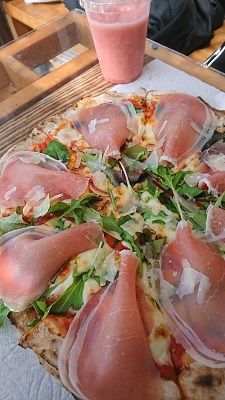 暖かくなって美味しいピザ ツイート 何度もご紹介している多摩川の川沿いにあるピザ屋さん 今日も行ってきました。 気温が上がり これからは、このピザが美味しく頂ける季節に それが❝生ハムとハーブのピザ❞です。 それと いちごのスムージー(写真の左上) 余り甘くなくて私は大好きです。 食べ続けているのに、何故かまた食べたくなるのは 美味しいからでしょうね( ^)o(^ )